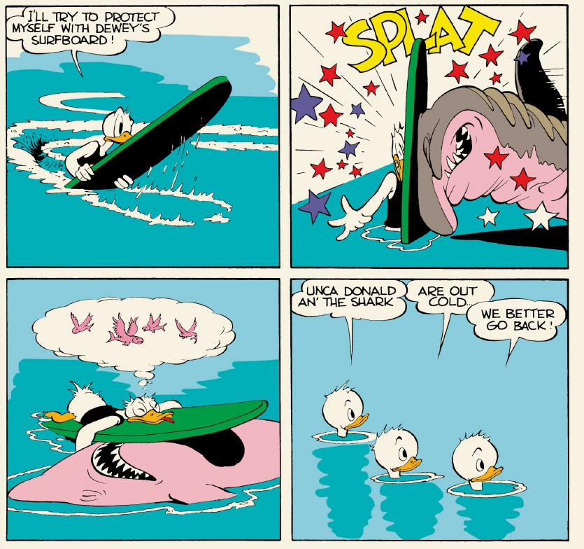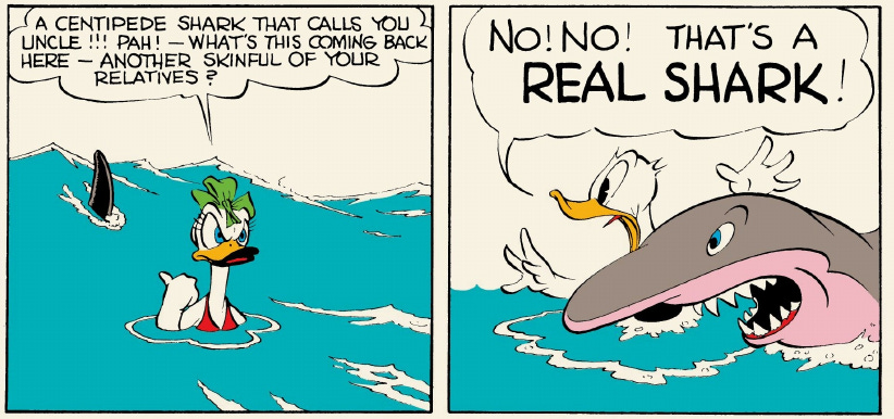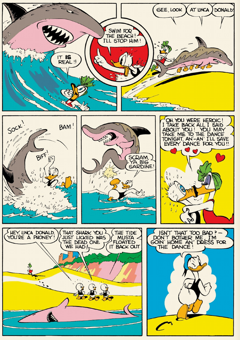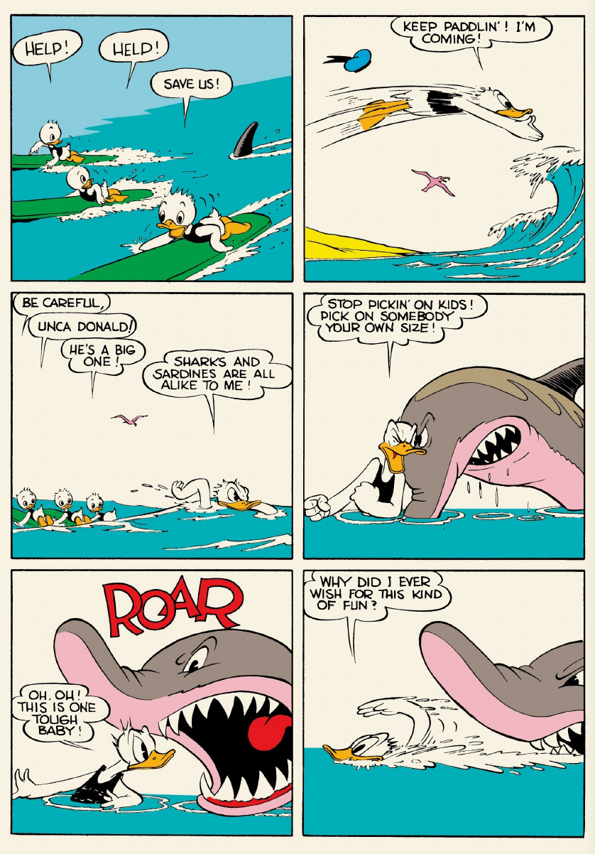 Both circles are performative. Donald takes the time to raise his finger and announce he will stop the shark. There’s far less urgency than in the beginning of the story, when he flew into the water to save the nephews. By the time he’s fighting the shark, Donald certainly knows and delivers his “Scram, ya big sardine!” quip right on cue.
