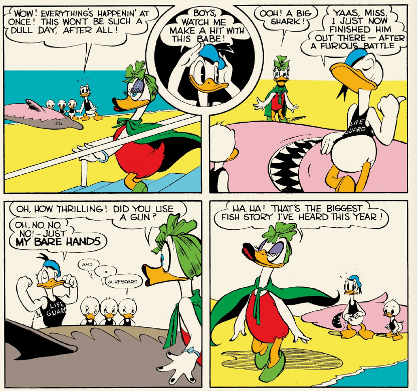His heroic moment has passed. When Donald tries to tout his heroism to a passing girl on the beach, she doesn’t believe him, since how could he have possibly defeated a shark? He doesn’t quite lie, but he certainly isn’t being honest.
