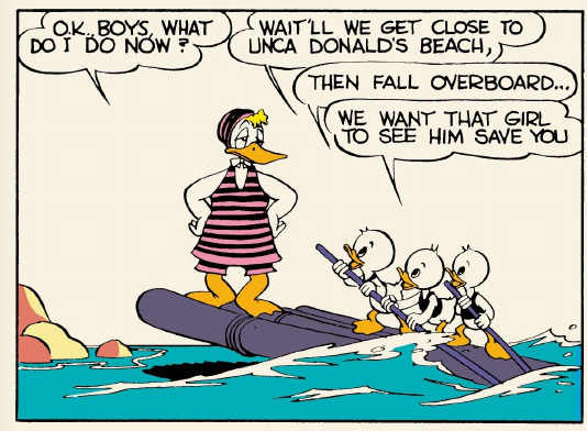 What ensues are a couple attempts by the nephews—grateful to Donald for saving their lives—to engineer fake rescue situations for him to look heroic to the girl. They all fail, naturally, leading to the girl thinking he’s even more of a posturing phony.