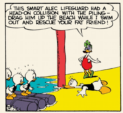 Fate and fortune once again hang over Carl Barks’s Lifeguard Days (WDC&S #33, June 1943), his second solo ten-pager. “Luck” per se isn’t involved the time, but the perverse moral arc of the universe asserts itself.