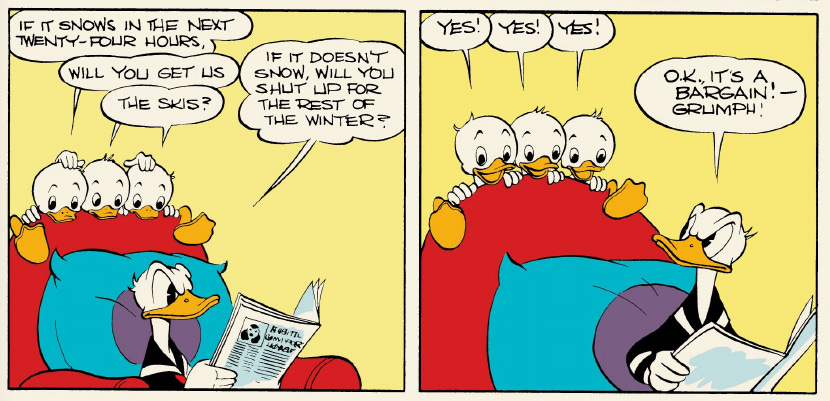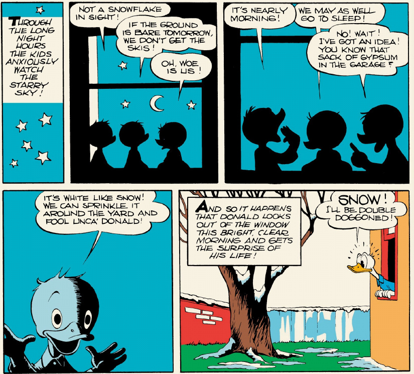 No snow is forecast, so the nephews put gypsum on the ground to fool Donald, who predictably blows up when he finds out he’s been swindled…only for a snowstorm will blow in as he’s chasing them.