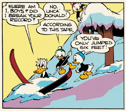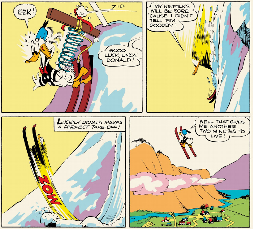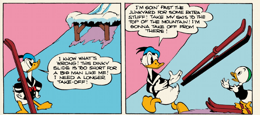 Despite the lightweight story, it’s probably Barks’s most skillful translation of cartoon gags to the comics page so far. The entire ski jump sequence plays smoothly and elegantly, as Donald thinks he’s actually going to set a new world record and, secondarily, not die: