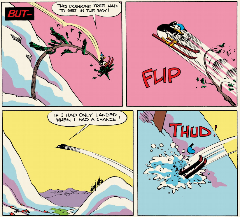 This is visually masterful, viscerally conveying the tree flip and reducing him to an out-of-control longshot blur. The large red-on-black BUT— lampshades the reader expectation that there’s no way Donald will succeed. It’s very satisfying in itself.