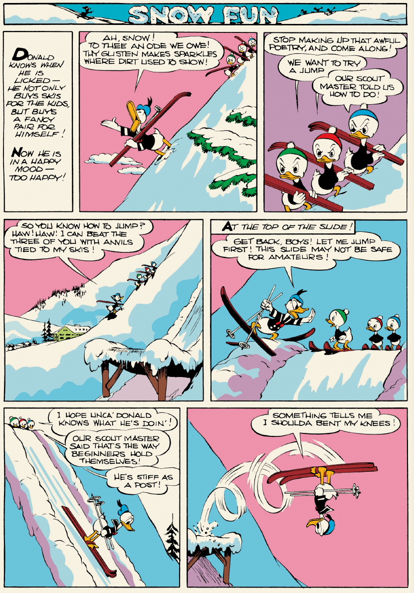 Snow Fun is a light and fluffy story next to its neighbors, consisting of two modest pieces yoked together rather crudely. Barks’s art continues to improve, with Barks skillfully recapturing some of the kineticism of the best Donald cartoon shorts—and developing Donald’s face as a major tool of emotion.